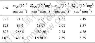 涂层抗氧化性能是通过测量试样在高温环境下氧化物的生成量,判断该物质的抗氧化能力[12, 15?16],大多实验表明,Al2O3涂层具有良好的耐高温性能[17?19]。实验中测得不同温度下紫铜样品与制备涂层样品的氧化质量增加数据,结果列于表4。mCu代表紫铜样品单位面积氧化质量增加,mTC代表喷涂涂层后的样品单位面积氧化质量增加。样品氧化动力学曲线近似符合抛物线规律,即符合公式:
