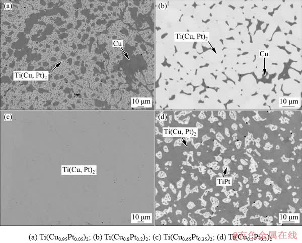 Electron probe microanalysis (EPMA) was employed to analyze whether the annealed alloys of Ti(Cu1-xPtx)2 (x=0.05, 0.2, 0.35, 0.5) are single phase or not. Figure 1 shows the phases present in the annealed alloys. It is seen that only the Ti(Cu1-xPtx)2 (x=0.35) alloy is single phase (Fig. 1(c)), while other samples contain at least two phases. So the single-phase sample Ti(Cu0.65Pt0.35)2 was chosen to determine its crystal structure of Ti(Cu,Pt)2.