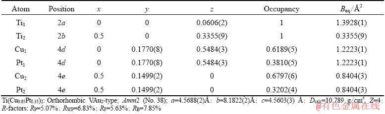 It should be pointed out that CENZUAL et al [26] also reported another structural type of Au2V which crystallized in orthorhombic space group Cmcm (No. 63). The unit cell has 12 atoms, 4 V atoms occupy 4c positions and 8 Au atoms occupy 8g positions. The results of structural refinement of Ti(Cu0.65Pt0.35)2 are Rp=6.46% and RWP=7.76% which are not as good as the results obtained with Amm2. This may be related to the quenching in water of the samples at 1073 K.