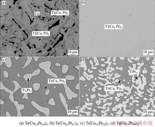 Microstructures of the alloys with compositions of Ti(Cu1-xPtx)3 (x=0.6, 0.7, 0.8, 0.9) are presented in Fig. 4. As can be seen, Ti(Cu0.3Pt0.7)3 alloy (Fig. 4(b)) is almost single phase. The elemental composition (25.08 at.% Ti, 22.52 at.% Cu, and 52.40 at.% Pt) of the compound was obtained from EPMA.