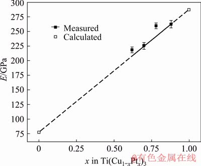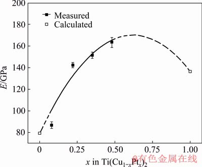 From Fig. 8, it is seen that E of Ti(Cu,Pt)3 shows approximately linear relation with Pt content, which meets the linear function E=210.23x+77.68. In Fig. 8 dashed lines show the possible variation tendency among calculated and measured values of E. It is worth noting that this curve is constructed by combining the experimental and calculated values of E of Ti(Cu,Pt)3, further confirmation and discussion on the actual variation trend are still needed.