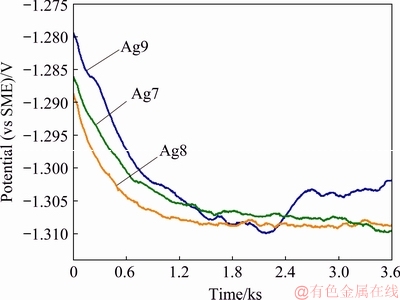 Fig. 5 Open circuit potential changes during corrosion test of Ag9, Ag8 and Ag7 alloys in 0.07 vol.% (NH4)2S