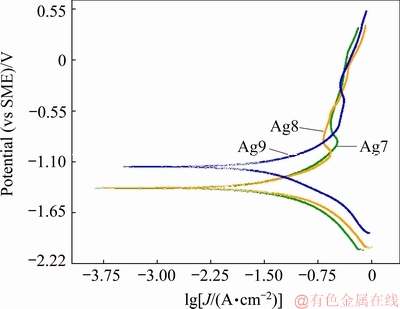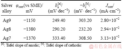Table 1 Corrosion current density and Tafel slopes for Ag9, Ag8 and Ag7 alloys in 0.07 vol.% (NH4)2S