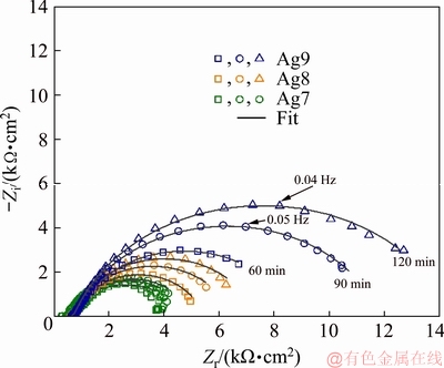 Fig. 7 Impedance diagram of corroding Ag9, Ag8 and Ag7 alloys in 0.07 vol.% (NH4)2S