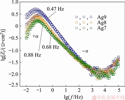 Fig. 8 Bode diagrams of corroding Ag9, Ag8 and Ag7 alloys in 0.07 vol.% (NH4)2S