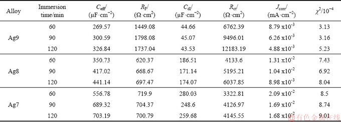Table 2 Fitting values of equivalent circuit elements for Ag9, Ag8 and Ag7 alloy in 0.07 vol.% (NH4)2S