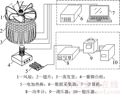 图1所示为实验装置示意图,主要包括实验段、数据采集系统、加热控制系统及加热部件等。实验段为新型热管。加热部件为从下到上收缩的紫铜台柱,其高度为54.0 mm,加热面直径为10.0 mm,接近上段加热面的台柱上部有3个直径为1.0 mm 孔,内插铜-康铜K型热电偶用于推算加热面中心温度,台柱底部有3个直径为8.0 mm的孔,内插3根额定功率为150.0 W的电加热棒,以模拟不同功率电子元器件的产热,实验过程中实际加热功率可通过调压器进行控制。在翅片热沉的上方装有驱动电压为12 V的风扇,用于将翅片热沉的散热。为减少热管的热量损失,对整个系统采取了较好的绝热保温措施。