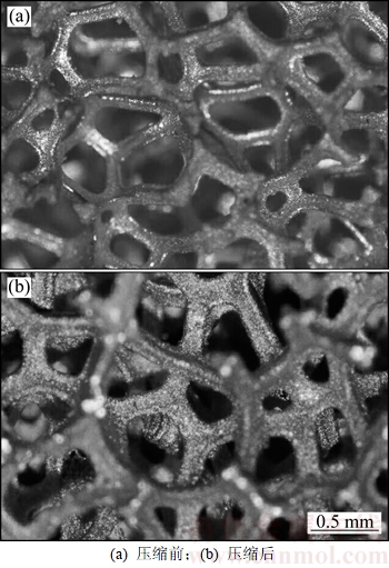 图2所示为压缩前后的泡沫铜金属扫描电镜照片。本文所用的泡沫铜金属由紫铜材料制备。为了增大毛细芯的毛细力,对泡沫铜金属进行了不同方向的压缩。从图2可以看出:泡沫铜金属压缩前后内部均呈三维网状结构,并互相连接构成众多相互连通的大小不同的多尺度孔隙,小孔孔径约为50 μm,大孔孔径约为0.5 mm,多尺度孔隙的存在,有利于解决蒸汽逸出与液体吸入间的矛盾问题,因为大孔利于蒸汽的逸出,小孔利于液体的吸入,由此可保证蒸发腔内汽液间的有序运动与循环。