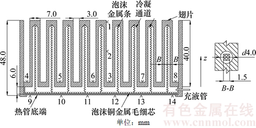 图3所示为新型热管的结构、尺寸及热电偶分布示意图。其中,翅片热沉的直径为100.0 mm,由6063铝合金加工而成,其总高度为48.0 mm,翅片高度为40.0 mm,翅片宽为7.0 mm,翅片间距为3.0 mm。另外,从图3(B-B截面图)还可以看出:在热管蒸发腔底部烧结有一层泡沫铜金属毛细芯,在翅片内部构造有直径为4.0 mm的圆孔,用于插入泡沫铜金属条(宽度为1.5 mm),且泡沫铜金属条底段与烧结在热管底部的毛细芯直接接触。本文采用铜-康铜K型热电偶测量温度,热电偶先用热电偶焊机焊成小球,然后将其焊接到热管底板及翅片上。图中:1~3测温点用于测量翅片上的温度,4~8测温点用于测量翅片基部温度,9~14测温点用于测量热管底板温度。