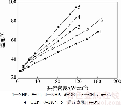 热管倾角对新型热管的热性能有一定的影响。在同一热流密度下,当θ=0°时,温度最低,θ=180°时温度最高,其原因在于:当θ=0°时,重力作用方向与工质流动方向一致,因此有利于液体工质流向蒸发端,避免蒸发端烧干;而当θ=180°时,重力会阻碍液体工质的流动,从而不利于液体工质的循环,导致蒸发端液体供应不足,从而使传热恶化。