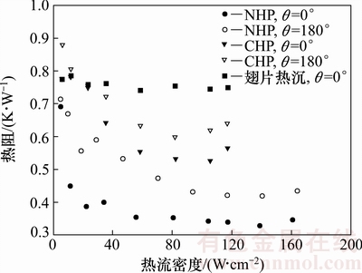 图6所示为系统热阻随热流密度的变化曲线。从图6可以看出,随着热流密度的增加,3种传热装置的系统热阻均逐渐减小,只是减小的程度不同。当θ=0°时,翅片热沉的系统热阻随热流密度的增加基本不发生变化,且翅片热沉的系统热阻比新型热管与传统热管的大,当q=117.2 W/cm2时,其最小系统热阻约为0.75 K/W;新型热管的系统热阻随热流密度的增加变化较大,且系统热阻一直处于传统热管与翅片热沉曲线的下方,当q=138.9 W/cm2时,其最小系统热阻约为0.33 K/W;传统热管的系统热阻一直处于二者之间,其最小系统热阻约为0.42 K/W。当θ=180°时,新型热管与传统热管的系统热阻均大于θ=0°时的热阻,且传统热管的系统热阻更大。