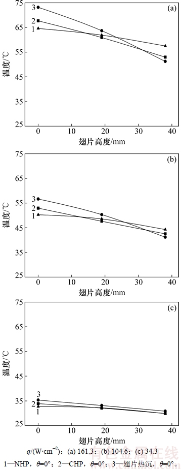评价翅片效率最基本的因素是翅片表面的温度分布情况,若翅片基部与末段温差小,则说明翅片效率高。图7所示为沿着翅片高度方向的温度分布。从图7可以看出:在低热流密度条件下,3种传热装置的翅片基部与末段温差不大,然而随着热流密度的增加温差增大。当q=104.6 W/cm2时,3种传热装置的翅片基部与末段温差较大。当q=161.3 W/cm2时,新型热管翅片基部与末段温差不超过6.9 ℃,传统热管为14.7 ℃,而翅片热沉温差高达21.7 ℃。