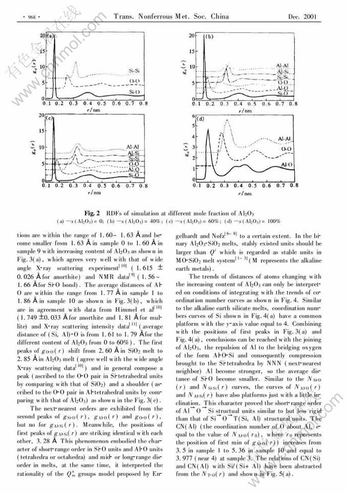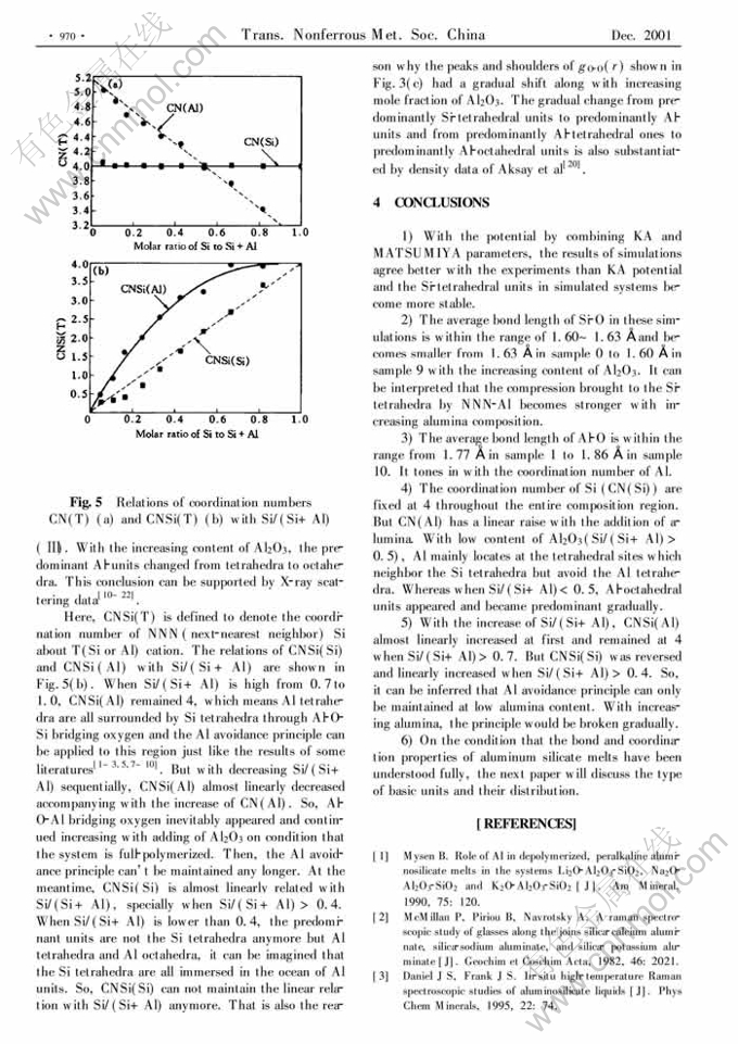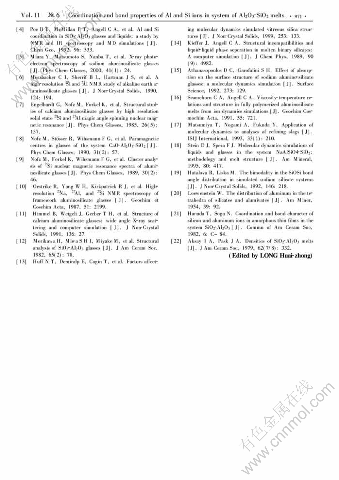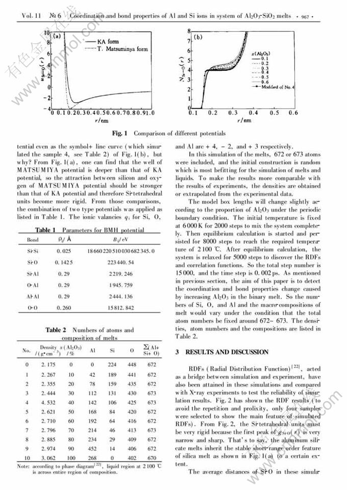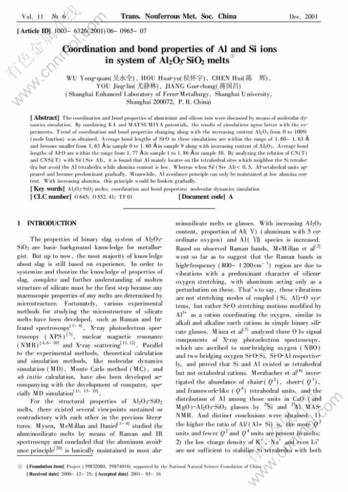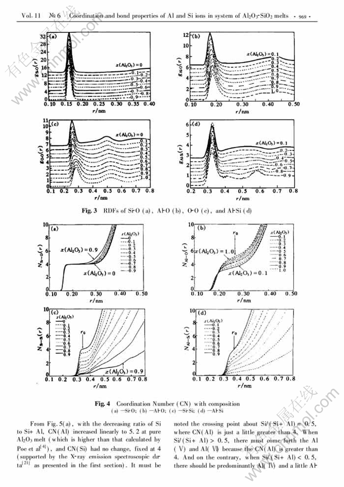 Key words:Al2O3-SiO2 melts; coordination and bond properties; molecular dynamics simulation