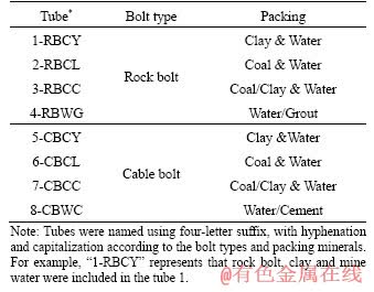 Testing of rock and cable bolts was conducted within a variety of material packings (as shown in Table 1 and Figure 1) including saturated clay, saturated coal, mine water and grout/cement. Rock bolts and cable bolts used in these experiments were the same types utilized at a longwall underground coal mine in the Sydney Basin, Australia. The mill scale layer from every bolt was removed prior to the experiments. This mill scale, which is usually only 0.1 mm in thickness, is designed to act as a cathodic protection layer to provide an initial barrier to atmospheric corrosion. The work to remove it was performed by professionals at the Jennmar factory in Sydney using industrial sanding equipment. The type of rock bolt used was HSAC 840 ribbed bolt with a core diameter of 21.7 mm and a total diameter of 23.6 mm including ribbing. The type of cable bolt used in the experiment was Plain Superstrand cable bolt with a total stand diameter of 21.8 mm. These types were chosen as they are well represented in the broken bolts database [20, 32]. The length of both rock bolt specimens and cable bolt specimens was limited to 1 m, in contrast to lengths of 2 m and 4-8 m within coal mines, respectively. This length was chosen to be suitable for testing in the laboratory. Strands were removed (8 inner and 8 outer) from every Plain Superstrand cable bolt, so that the cable bolt specimen was comprised of a centre strand encircled by one inner strand and one outer strand. Mine water, coal and clay were collected near the location where premature SCC failures had occurred in the same longwall underground coal mine in the Sydney Basin, Australia. Because the test column diameter was 60 mm, it was necessary to reconstitute the rock materials by tightly packing around the bolts, using a stiff rod to compact the materials by hand. The materials were therefore expected to be of reduced strength compared with in situ rock mass. However, this would not affect chemical reactions.