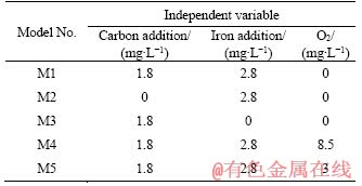 It was observed that oxygen was not exhausted during experiments, therefore oxygen was included in some of the models to evaluate the influence of DO. According to model M4 (as shown in Figure 4), when O2 value was set as 8.5 mg/L, the dominant redox couple in the solution was C/O2 and Fe/O2, indicating an excess amount of O2. In this case, more CO2 and Fe3+ were produced, without any sulphate reducing reaction. The pE value was consequently higher than 12, restricting sulphate reduction.