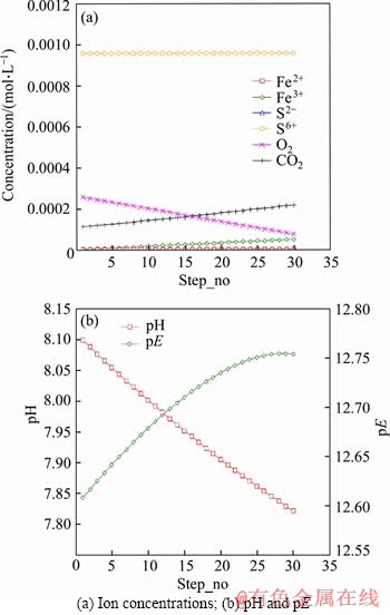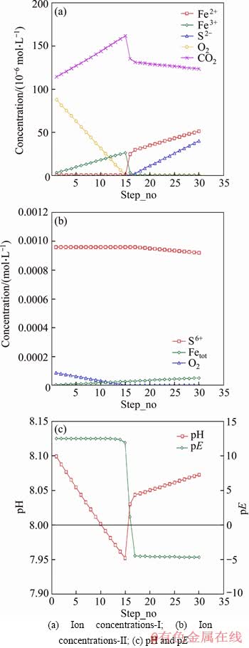 In contrast with model M3, iron addition was also specified in model M1, while other values remained the same as model M3. After 11 steps, sulphate in this model reached 88.97 mg/L (9.268×10-4 mol/L), which was close to the previous experimental value. The pH increased linearly while the pE value tended to decrease from -4.61 to -4.76 during the 11 steps as shown in Figure 8. Based on model M3, sufficient O2(8.5 mg/L) was included in model M4. This model showed that pH would decrease and pE would increase to over 12 (as shown in Figure 4(b)), while during the experiment, pH of both upper and lower samples declined sometimes, and the pH in lower regions changed slightly around the initial pH of 8.1. However, most upper water samples presented an obvious pH increase, the exact reason for which was unclear, but it was probably related to the complex compositions of both mine water and packing mineral materials.