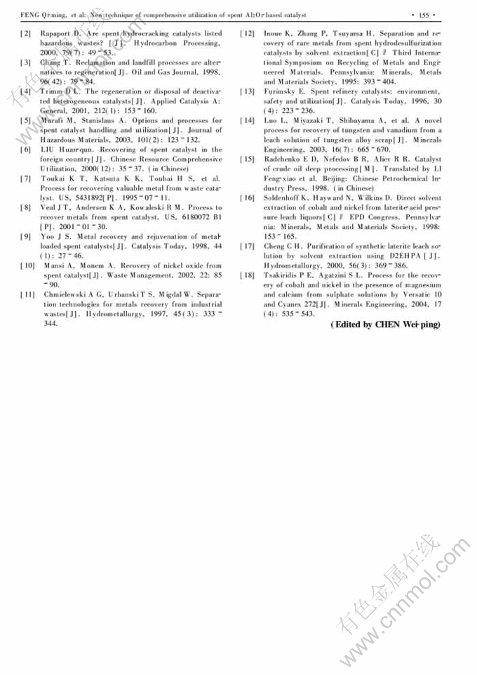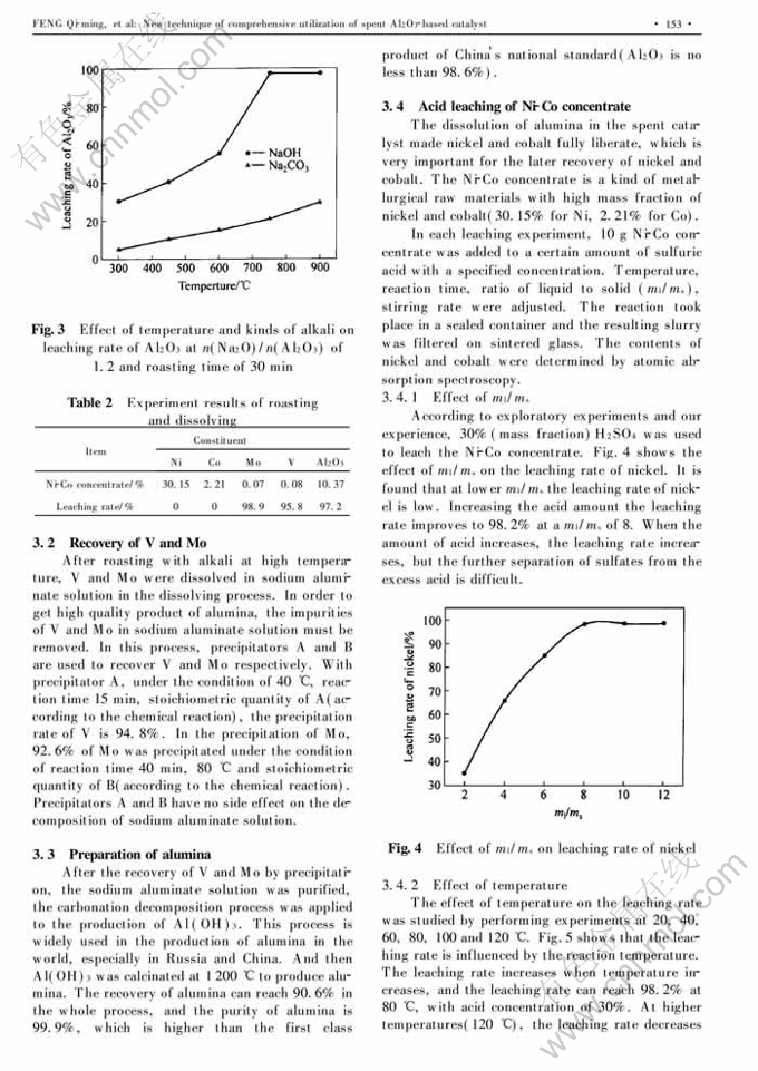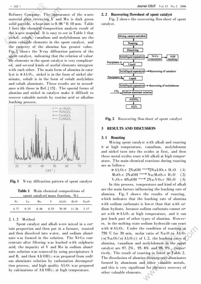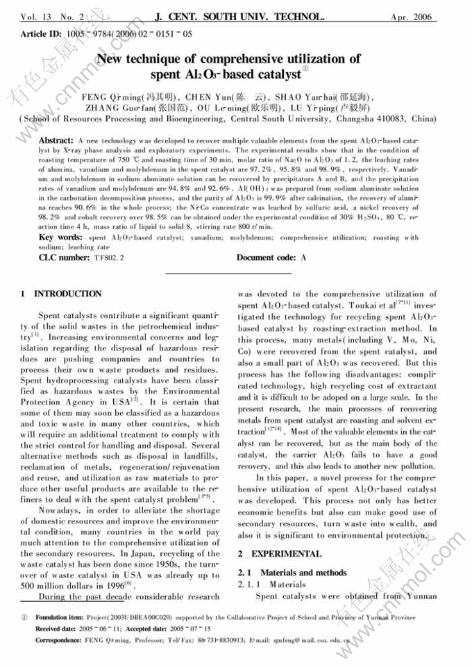 Key words:spent Al2O3-based catalyst; vanadium; molybdenum; comprehensive utilization; roasting with sodium; leaching rate