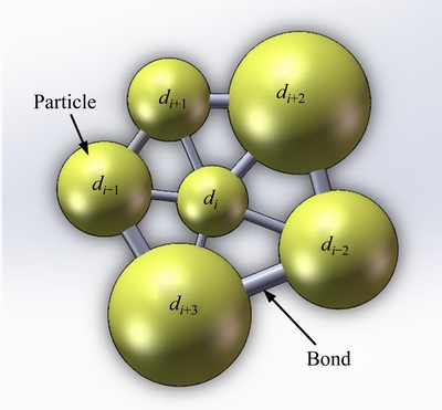 针对BPM模型中子颗粒不能进一步破碎造成的破碎粒度局限性,优化颗粒黏结模型粒度选取方法,选择多种粒度的小颗粒为基础颗粒组,构成矿石多颗粒黏结破碎模型。根据实际矿石破碎粒度分布,选取若干小粒度颗粒构成基础颗粒组,进而由黏结键黏结构成大颗粒,从而实现不同粒度表征。不同粒度颗粒组合弥补单一颗粒构成物料时造成的孔隙率过大问题,与实际矿石结构更为贴合。