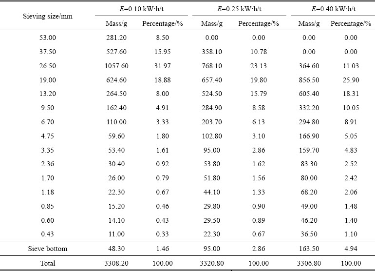 通过3种冲击能量的落重试验,得到的物料筛分粒度及筛余质量如表2所示。从表2可以看出,随冲击能量增大,破碎后最大粒度减小;粒度质量分数随粒度的增大先增加后减小,存在单个峰值。三种冲击能量下破碎的物料粒度质量分布如图4所示。由图4可知,曲线峰值在19~26.5 mm粒级之间,曲线峰值处粒度随冲击能量的增加而减小。除去筛底粉磨质量分数,筛上质量分数大于5%的组份在6.7 mm粒级以上,6.7 mm粒级以下组份质量占比较小;3种冲击能量下6.7 mm粒度以上颗粒总质量分数分别达到91.53%、84.22%和74.20%,破碎结果主要粒度在6.7 mm粒级以上。