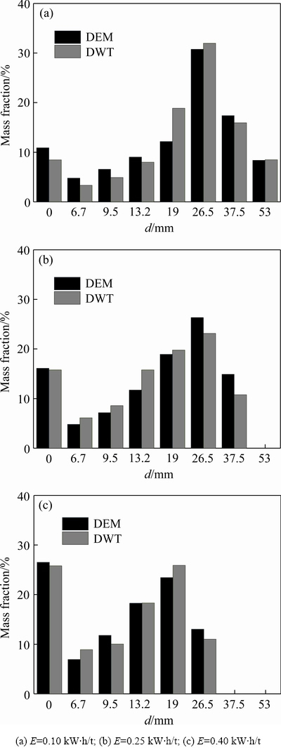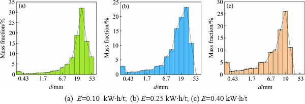 图4 不同冲击能量下破碎的物料粒度质量分布柱状图