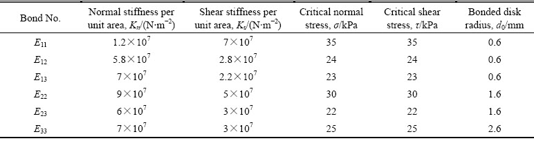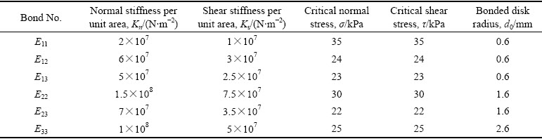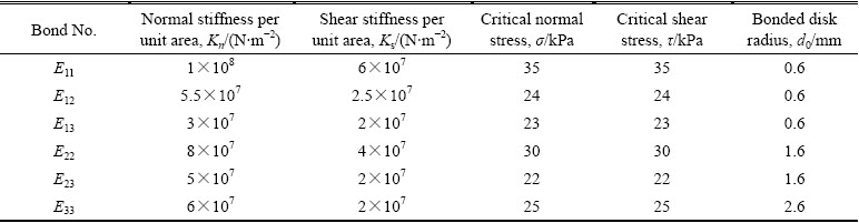 BPM模型的微观性能包括颗粒粒度和黏结键的刚度、强度和半径。粒径会影响物料的断裂韧性,从而影响破坏过程;而黏结键的形成、结合和破坏过程则表示了微观损伤过程并由此形成宏观断裂;颗粒粒度和颗粒间黏结键是构建BPM模型的两个关键参数[15]。