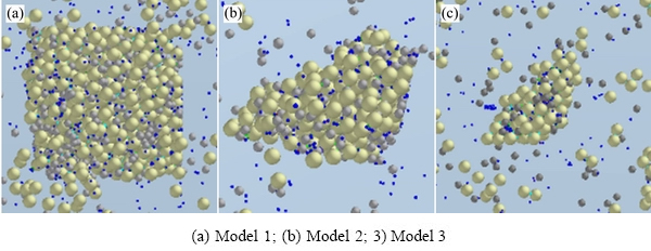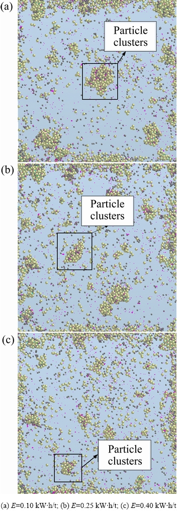 物料落重破碎仿真结果如图7所示。由图7可以看出,破碎后颗粒间键断裂并不完全,在大颗粒破碎后,一部分基础颗粒直接分离,另一部分基础颗粒仍然呈团簇状,形成不同粒度的颗粒团簇。同时,可明显看出,破碎后的物料最大粒度随冲击能量的增大而变小。