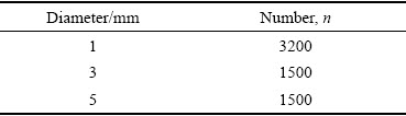 ,计算得到直径5 mm颗粒个数为1850个。为保证模型内部各直径颗粒分布均匀且满足粒度关系式(5),3 mm和5 mm直径的基础颗粒个数不宜相差过大,1 mm直径颗粒体积较小,个数适当增加用以填充大颗粒间的孔隙,保证模型内部结构紧凑。根据各基础颗粒之间体积比将部分5 mm颗粒替换为1 mm和3 mm颗粒,经计算调整,最终体积填充分数提升至
