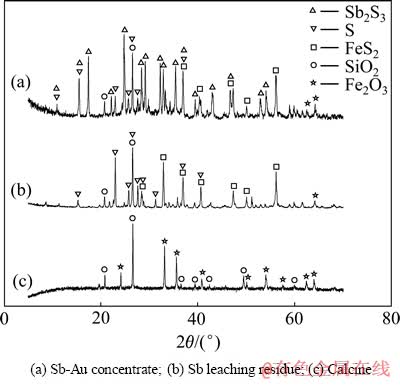 X射线衍射仪型号为D8-Advance,根据XRD谱(见图2)可知,锑金精矿的主要物相为辉锑矿(Sb2S3)、黄铁矿(FeS2)和石英(SiO2),还含有少量氧化铁矿物以及单质硫;浸锑过程中随着辉锑矿的分解,锑以相应氯化物的形式进入溶液中,硫以单质的形式富集于渣中,浸锑渣的主要物相为单质硫、黄铁矿(FeS2)、石英(SiO2)以及少量氧化铁矿物;焙砂的主要物相为石英(SiO2)和赤铁矿(Fe2O3),说明浸锑渣中的单质硫和黄铁矿经过焙烧后被充分的氧化。