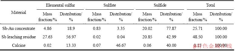 表2表明,锑金精矿中硫主要以硫化物的形式存在,硫化物主要包括辉锑矿以及黄铁矿;浸锑后,辉锑矿分解,使得浸锑渣中硫化物所占比率降至42.99%;与此同时,单质硫富集于渣中使得单质硫所占比率提高到56.97%;经过焙烧后,浸锑渣中大量的单质硫以及黄铁矿中的硫被氧化脱除,总硫含量降至0.15%,硫的脱除率达到99.84%,残余的硫以硫酸盐为主。