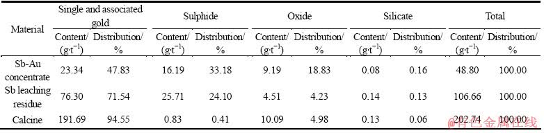 表3表明,锑金精矿中47.83%的金以单体金和连生金的形式存在,33.18%和18.83%的金分别赋存于硫化矿物和氧化矿物中,赋存于硅酸盐中的金所占比例极小;浸锑过程中金得到富集,浸锑渣金品位达到106.66g/t,随着辉锑矿和锑华以及方锑华的分解,部分金被解离,以单体金和连生金形式存在的金所占比例提高至71.54%,同时,赋存于硫化矿物和氧化矿物中的金所占比例均降低,但依然高达28.33%;焙砂中金随着硫的脱除进一步富集,基本上是以单体金和连生金的形式存在,少量赋存于赤铁矿中。