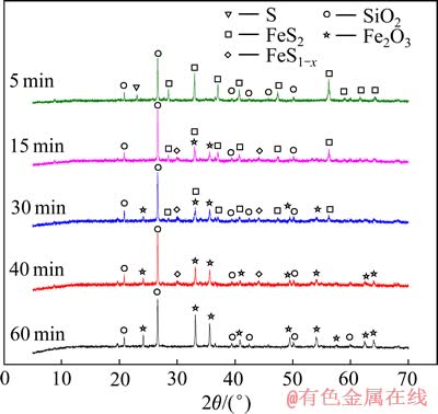为了更进一步了解焙烧过程中单质硫和黄铁矿被氧化的过程以及焙烧机理,分别对经不同时间焙烧的焙砂进行XRD分析,结果如图4所示。