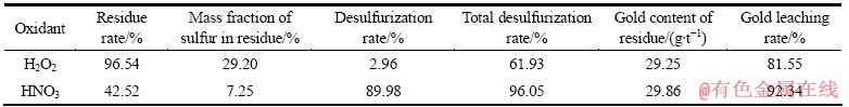 同时,为了证明黄铁矿是影响金浸出最主要的因素,对热碱脱硫渣进行了化学氧化,各取热碱脱硫渣25 g,分别采用H2O2和浓HNO3两种化学物质来氧化黄铁矿,其化学反应如下: