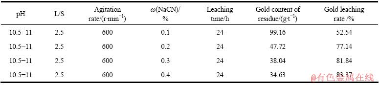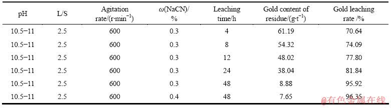 由表6可知,随着氰化钠浓度的增加,金的浸出率逐渐增大。氰化钠浓度为0.3%时,金的浸出率为81.84%,当氰化钠浓度增加到0.4%时,金的浸出率为83.37%,变化不明显,故选0.3%为最佳含量。由表7可知,氰化钠浓度为0.3%,金的浸出率随着时间的延长逐渐增大,当浸出时间为48 h时,金的浸出率达到95.92%,浸金效果良好,为了进一步确定氰化钠最佳浓度范围,研究氰化钠浓度为0.4%,浸出48 h后,金的浸出率达到96.35%,较浓度为0.3%时金的浸出率仅增加了0.43%。综上所述,氰化钠的最佳浓度为0.3%,最佳浸出时间为48 h。