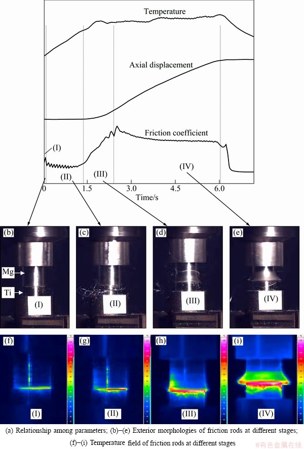 In order to understand the relationship among above parameters, the curves of temperature, axial displacement and friction coefficient versus time are shown in Fig. 8(a). Figures 8(b-e) show the exterior morphologies of friction rods in different friction stages taken by high-speed photography. Figures 8(f-i) present the temperature filed of friction rods in different friction stages obtained by red thermal imaging system. In general, one can notice that the variant of various parameters can be divided into four stages. In the first friction stage, there were no axial displacement and friction chip (Fig. 8(b)). In the meantime, the temperature rising of friction interface was also not obvious, coupled with the rapid increase of friction coefficient from 0 to about 1.5. In the second stage, although the friction chips were formed (Fig. 8(c)), the axial displacement was not obvious, but the temperature rising of the friction interface was apparent. At the same time, the friction coefficient reached a platform. In the third stage, the temperature has been elevated to a maximum value, and the axial displacement tended to occur, accompanied with the gradual increase of friction coefficient. It was obvious that the friction flashing appeared for Mg rod due to the plastic flow (Fig. 8(d)). In the fourth stage, the temperature and friction coefficient reached steady stages while the axial displacement increased continuously. Meanwhile, the plastic deformation of Mg rod was obvious (Fig. 8(e)).