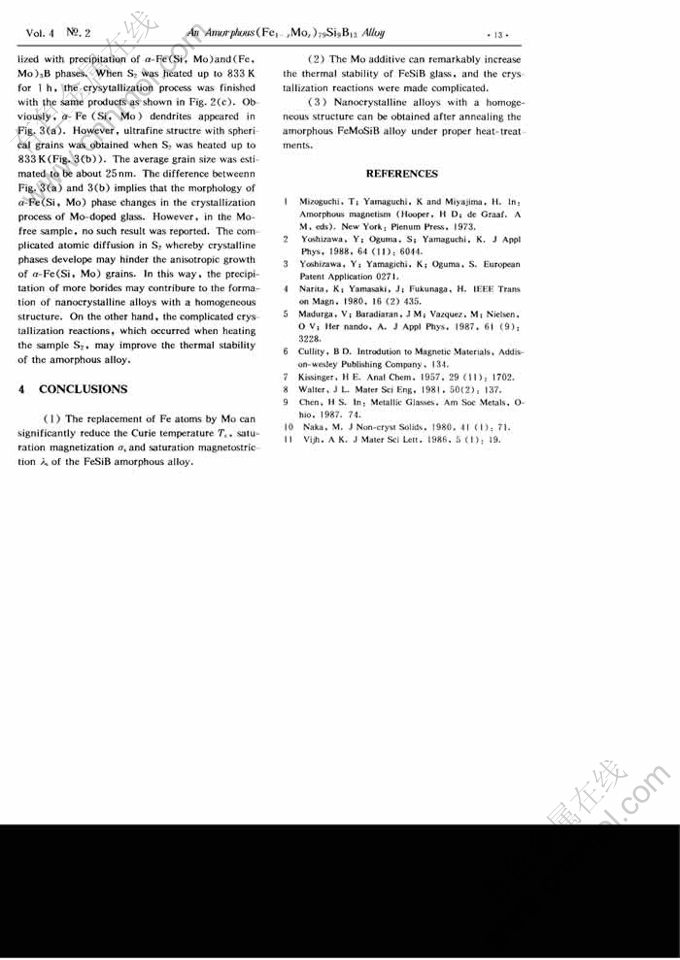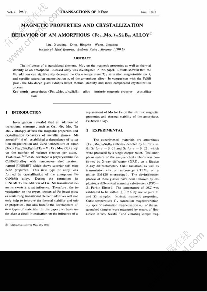 Key words:e:amorphous; (Fe0.99 Mo0.01) 78Si9B13 ; alloy; intrinsic magnetic property; crystallization
