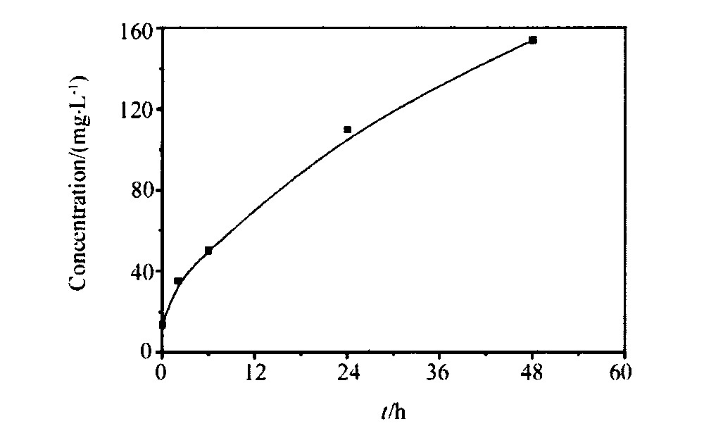 纳米银粒子具有很高的活性, 在常温常压下可部分溶解于氨水。 图3是将0.500 g自制的纳米银粉分散在1000 ml水中, 加入30 ml浓氨水后, 放置不同时间, 取出一部分进行高速离心分离后, 去上层清液用原子吸收法检测其中银元素的含量。 用同样的方法测得未加氨水的上层清液银的浓度为6.5 mg·L-1 。 从图3中可看出, 随着时间的推移, 上层清液中银的含量在不断变大, 即有越来越多的纳米银粉转化成了银氨络离子而溶于氨水溶液中。