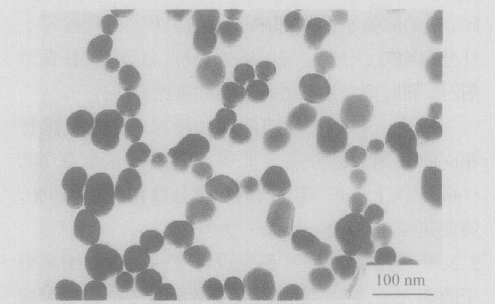 图7为固液分离后制备的纳米银固体粉分散在无水乙醇中的TEM照片。 从图中可看出, 经固液分离后的银粉的粒子平均粒径约为40 nm, 粒子呈球状, 而且也具有较好的分散性。