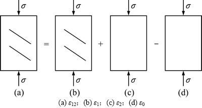 损伤耦合的条件是在一定应力作用下,2种损伤分别引起的损伤应变之和等于耦合损伤引起的应变量,如图1所示,假设图1(a)~(d)所示分别为同时含有宏观和细观损伤的岩体、仅含宏观损伤的岩体、仅含细观损伤的岩体及完全不含损伤的岩体,其弹性模量分别为