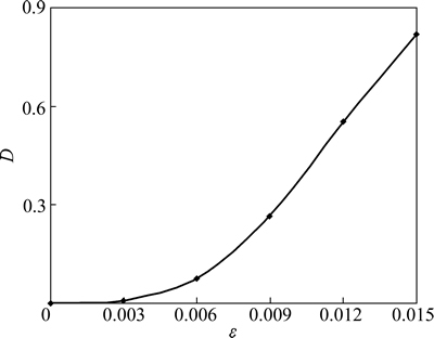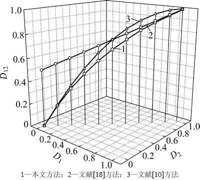 由图2可以看出:由本文方法计算出的耦合损伤变量最小,而随着宏观和细观损伤变量的增加,由文献[18]方法计算出的耦合损伤变量逐渐大于由文献[10]方法的计算结果。这说明文献[10]和[18]所提出的方法过大地估计了宏观和细观损伤的耦合影响,分析认为产生这种情况的主要原因是由于文献[10]过大地估计了由损伤产生的应变,而文献[18]则缺乏相应的理论基础,因此认为本文所提出的计算方法是较为合理的。