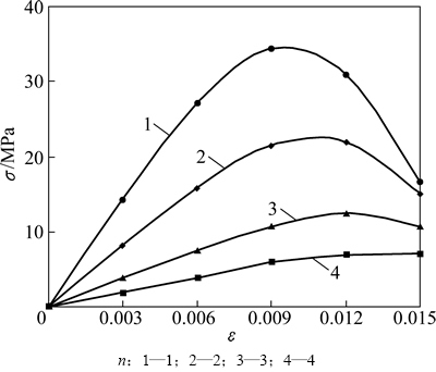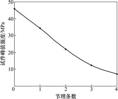 下面利用上述模型对含多条节理的岩体力学特性进行分析。采用的计算模型为图5所示倾角为45°的节理试件,取平行节理条数n=1~4条,计算结果如图8和图9所示。可以看出:1) 随着节理条数增加,岩体应力应变曲线斜率降低,这说明岩体的弹性模量随着节理条数的增加而降低,即节理岩体的变形增加,柔性变大;2) 随着节理条数增加,岩体峰值强度逐渐降低,当节理条数为1~4时,对应的岩体峰值强度分别为34.35,21.94,12.40和7.14 MPa,相比相应完整岩石的峰值强度45.92 MPa均有不同程度的下降。且由图9可以看出:随节理条数增加,试件峰值强度的下降趋势逐渐变缓。同时从下降幅度来看,当节理条数由1条增加到2条时,强度下降幅度最大,而当增加到3和4条时,强度下降幅度明显减小,这说明节理之间存在着相互作用,作用结果将导致岩体的总体强度更加弱化,不符合单纯的线性组合原理[21];3) 随着节理条数增加,试件峰值应变即峰值强度所对应的应变是逐渐增加的。这说明随着节理条数增加,试件在破坏之前的变形越来越大,这主要因为在压缩荷载作用下试件的总变形等于岩块变形与节理面变形之和,而在压缩荷载下节理面的闭合变形及剪切滑移变形量要比同等体积的岩块大得多,因此随着节理条数增加,试件在破坏前的总变形也将随之增大。因此,该计算结果也说明上述模型是合理的。