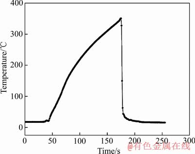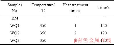 实验材料为7N01-T5铝合金,具体成分如表1所示。实验样品尺寸为5 mm×40 mm×140 mm。7N01铝合金的热矫正温度为350 ℃,加热时间控制在2 min内[3]。采用KSL-1200X型加热炉(合肥科晶材料技术有限公司)和GP20型(日本横河公司)高精度温控仪记录热处理过程中的热循环曲线,如图1所示。为了讨论方便,自定义了试样的编号,如表2所示。