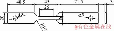 慢应变速率拉伸试验(Slow strain rate test, SSRT)参照HB 7235—95标准进行[13]。利用西安力创WDML-5型SSRT试验机进行试验,试样尺寸如图2所示。试验介质分别为空气和3.5% NaCl+10 mL/L H2O2,实验温度为室温。SSRT试样安装完成后,加载一定的载荷以便消除夹具间隙,应变速率为6×10-6 s-1。由标准HB 7235—95可知,利用ISSRT指数比单项力学性能指数能够更好地评价应力腐蚀敏感性[13]。ISSRT指数的计算公式如下: