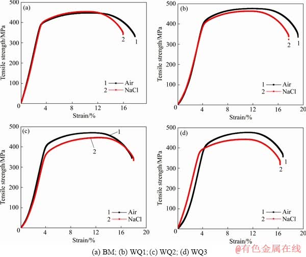 Fig. 4 SSRT curves of 7N01-T5 alloy in 3.5%+10 mL/L H2O2 solution with different heat straightening number