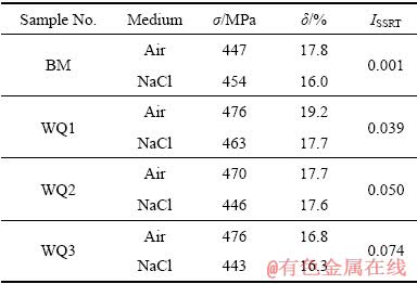 分别为试样在3.5% NaCl+10 mL/L H2O2溶液中的拉伸强度(MPa)和伸长率(%);