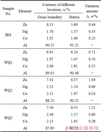 透射电镜(TEM)主要用于分析7N01铝合金析出相在晶粒内、晶界附近的分布状况,并借助能谱仪(EDS)对晶界析出相、晶内析出相及无沉淀析出带的化学成分进行分析,探针直径为3 nm左右。TEM样品经机械减薄至30 mm左右后,制备成直径为3 mm的圆盘状样品,经离子减薄后进行观察。在Tecnai G2 20 S-Twin型透射电镜上进行样品观察,加载电压为200 kV。