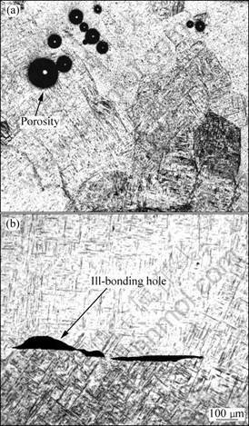 Fig.1 Appearance of defect produced in laser formed alloy: (a) Porosities; (b) Ill-bonding holes