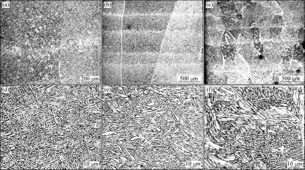 Fig.4 Optical micrograph of laser formed Ti-6Al-4V-xNd: (a)-(c) Macrostructure; (d) - (f) Microstructure; (a) and (d) Ti-64+ 0.1%Nd; (b) and (e) Ti-64+0.3%Nd; (c) and (f) Ti-64+0.5%Nd