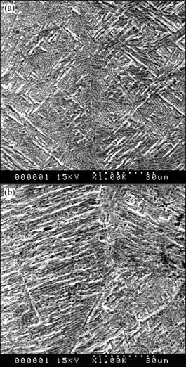 The columna to equiaxed transition is not prone to occur in most of the region in the molten pool for the small freezing range of Ti-64 alloy[18-19]. As a result, the macrostructure of laser formed Ti-64 is made up of huge columnar crystals. For Ti-6Al-4V-xNd alloy, the freezing range becomes larger with the increase of the content of Nd element according to the Ti-Nd binary alloy phase diagram. As a result, the composition undercooling area increases continuously too. Therefore, the columnar to equiaxed transition is easy to occur as observed in our experiments. Rare earth Nd can elevate the transformation temperature of α→β and promote the nucleation and growth of α phase. Thus with the additive of the rare earth Nd to Ti-64 powder, the laser formed microstructure changes from Widmanst?tten morphology to a basket weave microstructure since the nucleation occurs not only at the PβG boundary but also within the β grain. It is the nucleation fairly occurred within the β grain that restrains the formation of Widmanst?tten a. With the increase of Nd content further, α phase grows dominantly. Hence α laths presents an evident coarse tendency to be colony. Furthermore, Nd enriched on the grain boundary is favorable to the nucleation and growth of a phase. The more the content of Nd, the easier the above-mentioned course occurs. So the grain boundary of prior β becomes wider and more distinct with the increase of the content of Nd as illustrated in Figs.4(a)-(c). Fig.5 shows the appearance of the grain boundary of Ti-6Al-4V-0.1Nd and Ti-6Al-4V-0.5Nd. It can be found that there are a colonies grown from grain boundary with the increase of Nd content to 0.5%. The developed α colonies are unfavorable to the ductility of the laser formed alloy.