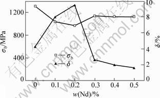 Fig.6 Influence of Nd content on room tensile properties of laser formed Ti-64 alloy