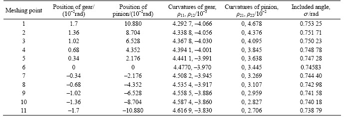 Considering that tooth number of pinion is less than the ones of shaper, the contact point of face-gear drive is presented, in which the contact path shifts as a result of assembly error [13]. Before carrying out LTCA based on “Hertz theory on normal contact of elastic solids”, it is necessary to obtain the contact points and their principal curvatures. Discarding assembly error, a numerical example is taken into account, as listed in Table 1.